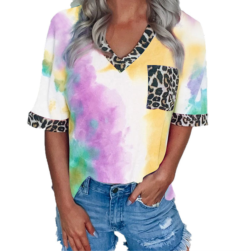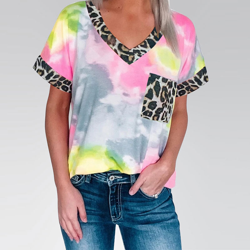 Macymars™ Fresh And Sweet Casual Tie Dye Leopard Pocket Women’s T-Shirt