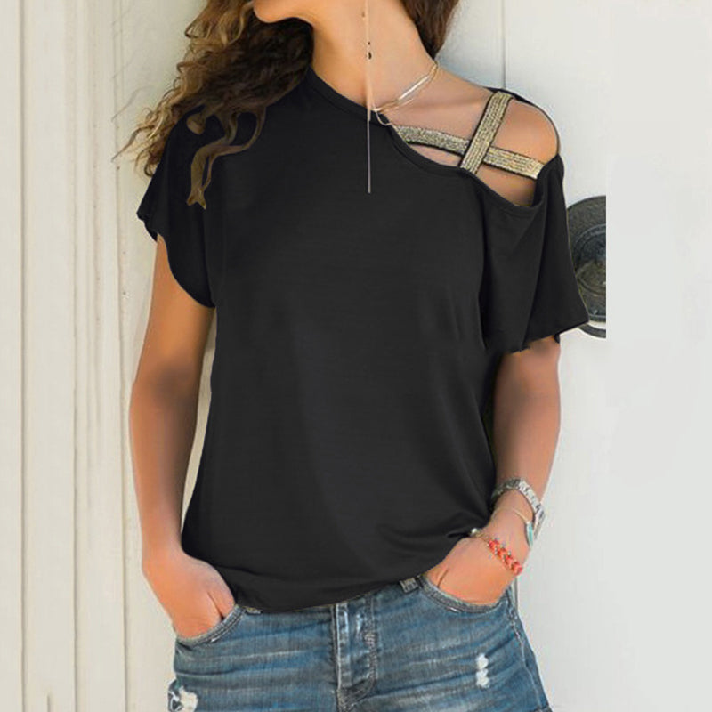 Macymars™ Spring And Summer Solid Color Casual Slanted Shoulder Cross Irregular Short Sleeve Women’s T-Shirt